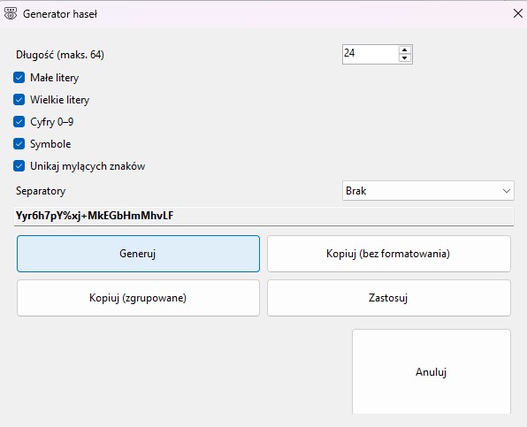 Generator pomaga tworzyć naprawdę losowe hasła — to największy czynnik wpływający na bezpieczeństwo.
